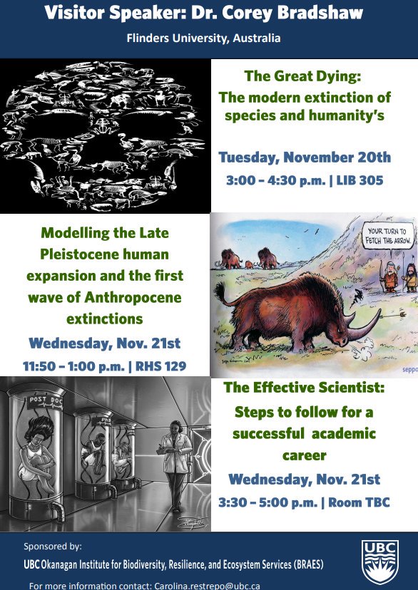 20-21.11.2018: Corey Bradshaw gives three invited seminars at the BRAES Institute at the University of British Columbia, Kelowna, Canada