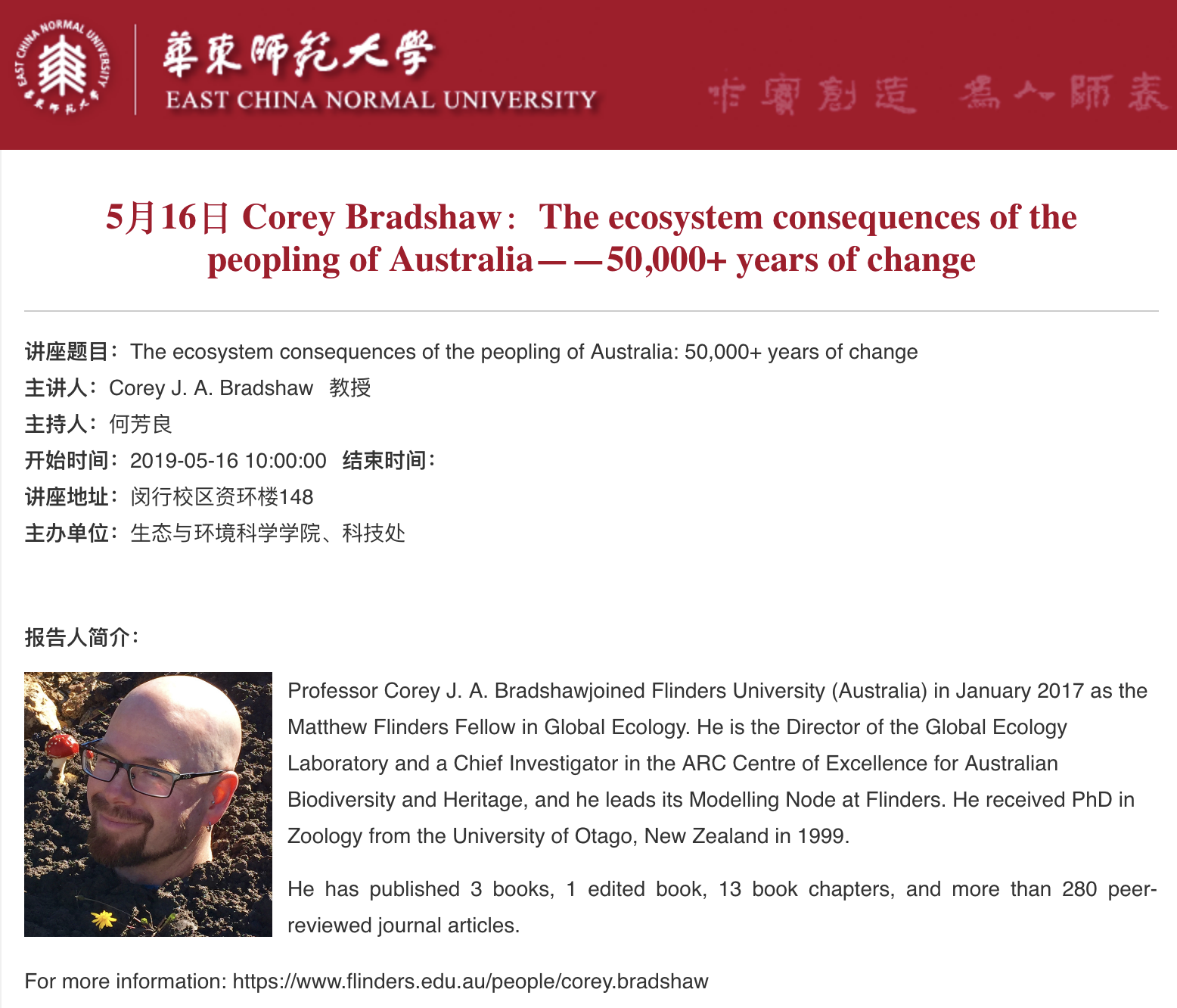16.05.2019: Corey Bradshaw speaks at the ECNU-UAlberta Joint Lab for Biodiversity Study, East China Normal University, Shanghai (China): ‘Ecosystem consequences of the peopling of Australia: 50,000+ years of change‘