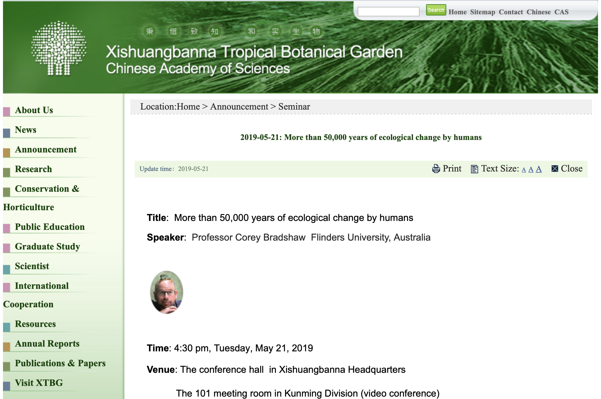 21-22.05.2019: Corey Bradshaw speaks at the Xishuangbanna Tropical Botanical Garden, Chinese Academy of Sciences, Yunnan (China): ‘More than 50,000 years of ecological change by humans‘ & ‘Becoming and effective scientist’