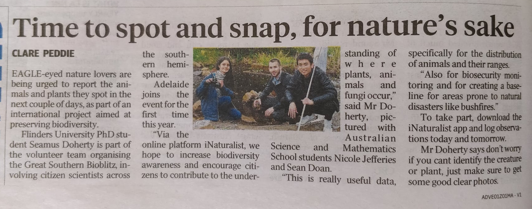 28.09.2020: Seamus Doherty interviewed about the Great Southern Bioblitz (ABC, Adelaide Advertiser, Flinders Blog)