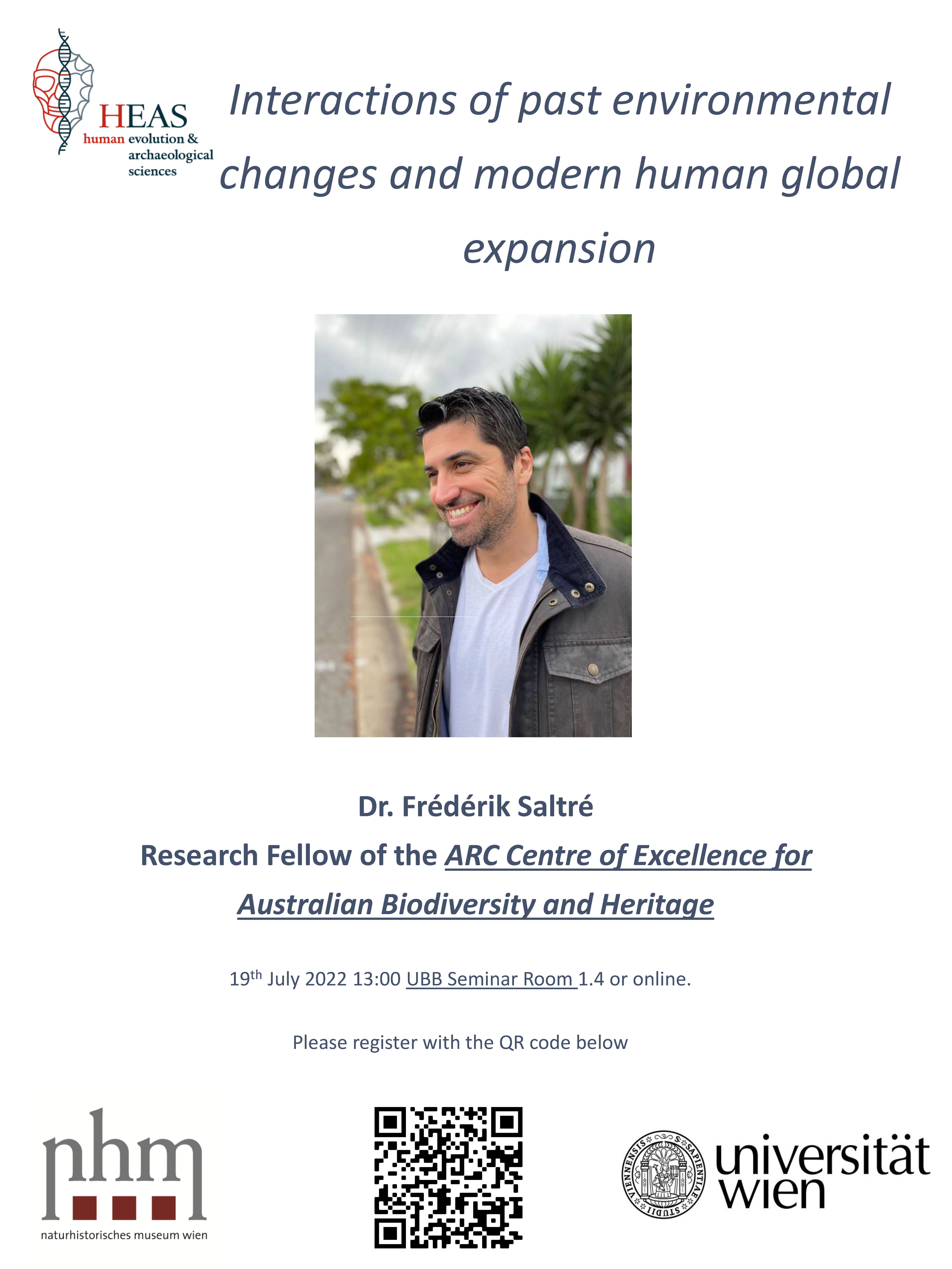 19.07.2022: Frédérik Saltré presents ‘Interactions of past environmental changes and modern human global expansion’ to the Department of Human Evolution and Archaeological Sciences at the University of Vienna