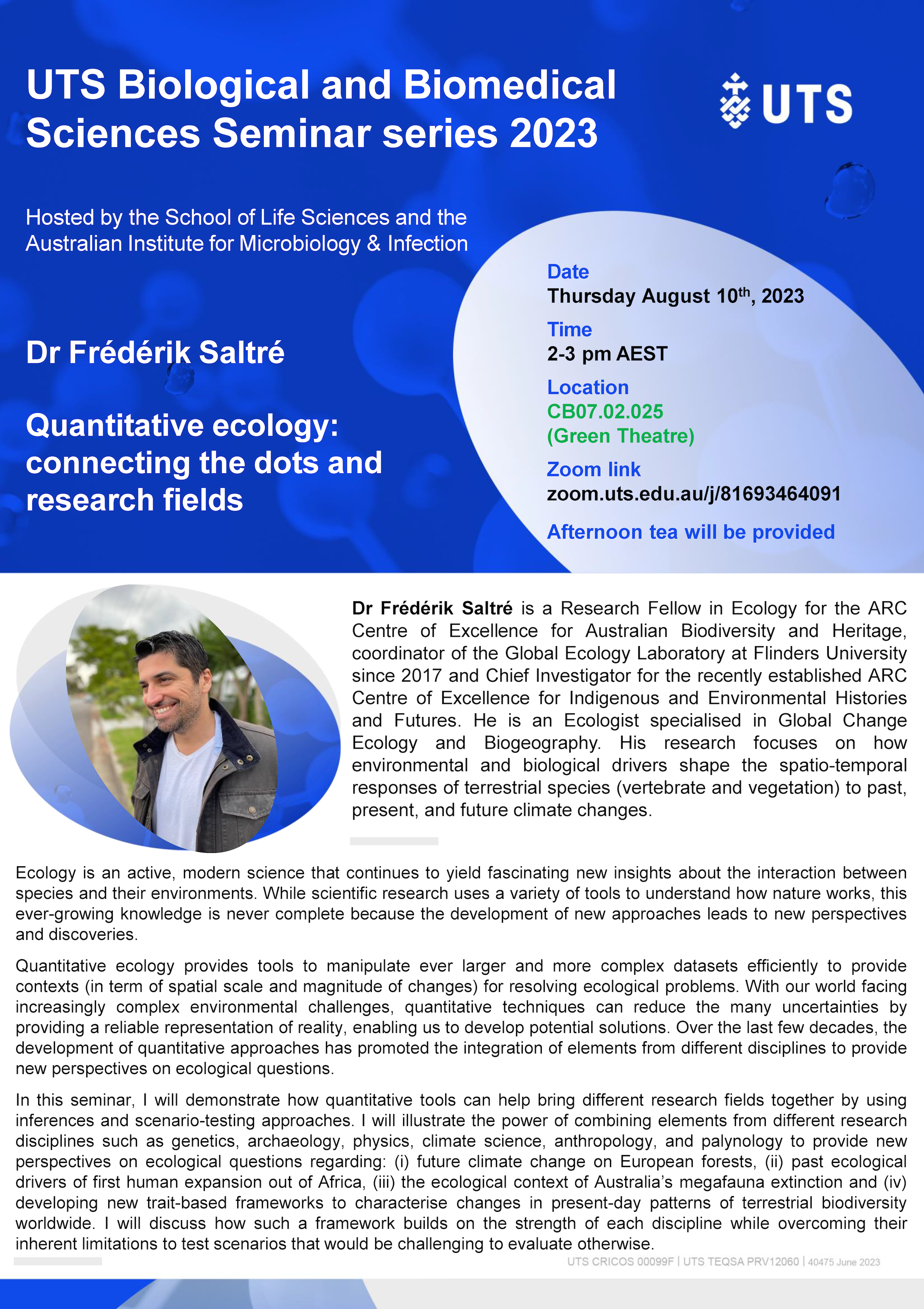 02.08.2023: Frédérik Saltré delivers invited seminar to the University of Technology Sydney: ‘Quantitative ecology: connecting the dots and research fields’