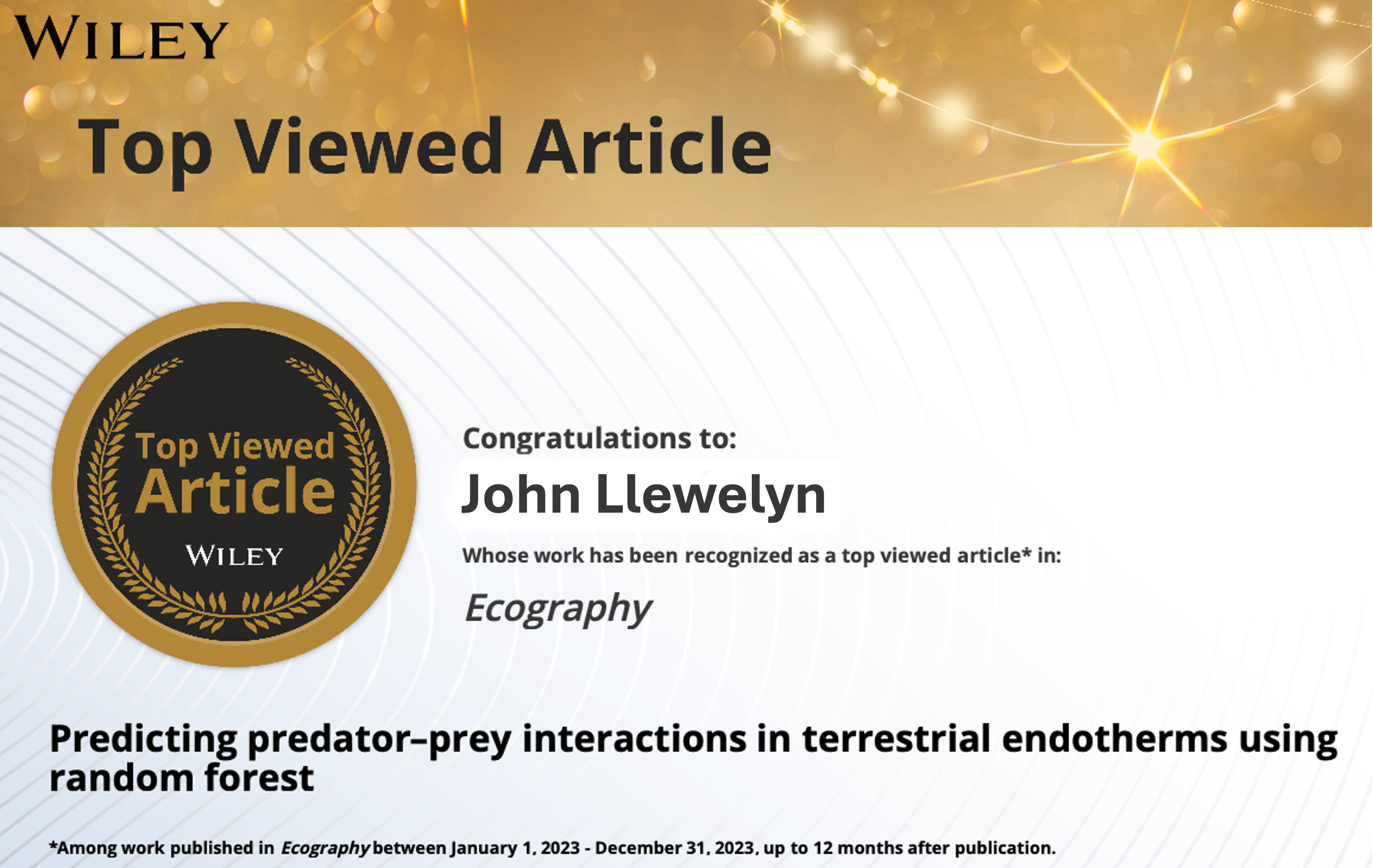 16.04.2025: Dr John Llewelyn recognised by Ecography for his highly viewed 2023 paper: Predicting predator-prey interactions in terrestrial endotherms using random forest.